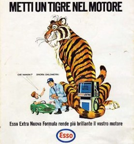 Era uno slogan – oggi si chiama claim – pubblicitario di quando ero piccolo, in epoca più o meno tardo barocca: era girato con cineprese in ebano e palissandro e si guardava in un televisore in osso, con lo schermo di ossidiana. “Metti un tigre nel motore” incitava l’automobilista a fare rifornimento presso i distributori Esso.