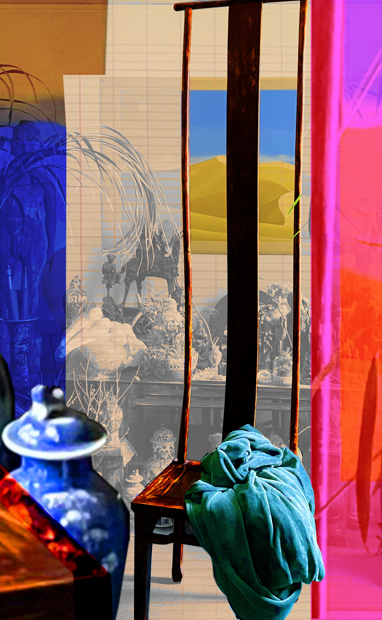 Quando entrammo in quello studio oltre la soglia del mondo conosciuto, entrai in effetti in un mondo altro: la stanza era molto ampia, ma pareva addirittura illimitata, come se le pareti fossero in realtà degli assi cartesiani potenzialmente infiniti per profondità e altezza. Lungo l’ascissa si affastellavano oggetti di diversa natura senza alcuna gerarchia nella disposizione: un tavolino basso, un tavolo grande ingombro di piccole statue e vasi bianchi e blu di diversa grandezza, un baule in tutto simile alla cassa di un tesoro, un lettino, alcune sedie, piante rigogliose e altre sopravvissute alla meglio; lungo l’ordinata, invece, oltre a due o forse tre librerie alte e chiuse da ante a vetri e ad alcune divinità dai corpi a grandezza quasi umana, campeggiava al centro della stanza una sedia dalla seduta molto bassa e dallo schienale alto fin quasi al soffitto: dov’ero capitata? mi sembrava di essere Riccidoro nella casetta degli orsi, dove tutto era o grande grande o piccolo piccolo, oppure Alice in una versione asiatica del paese delle Meraviglie; ma anche Mowgli tra le rovine del tempio induista invaso dalla vegetazione della giungla.